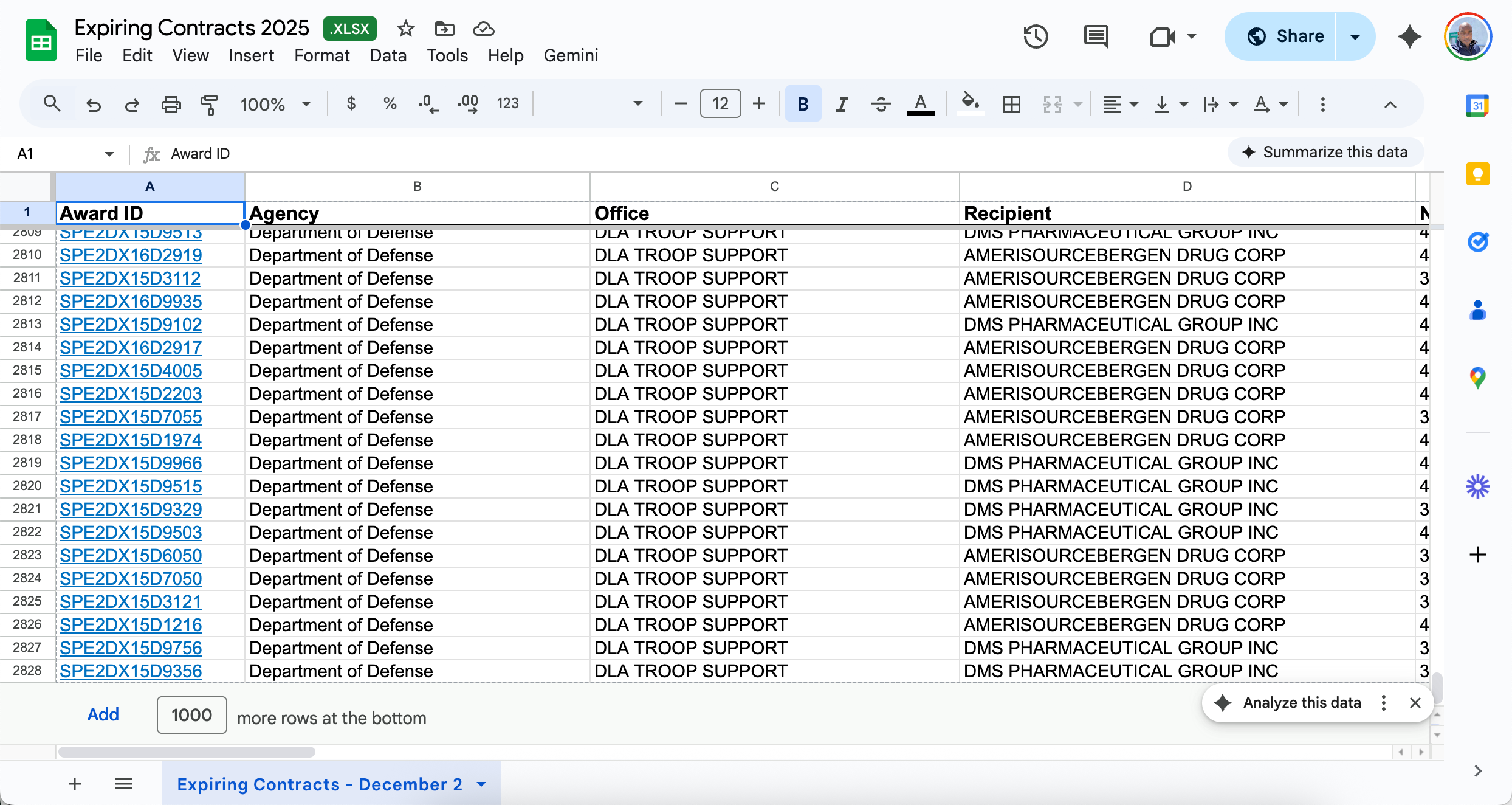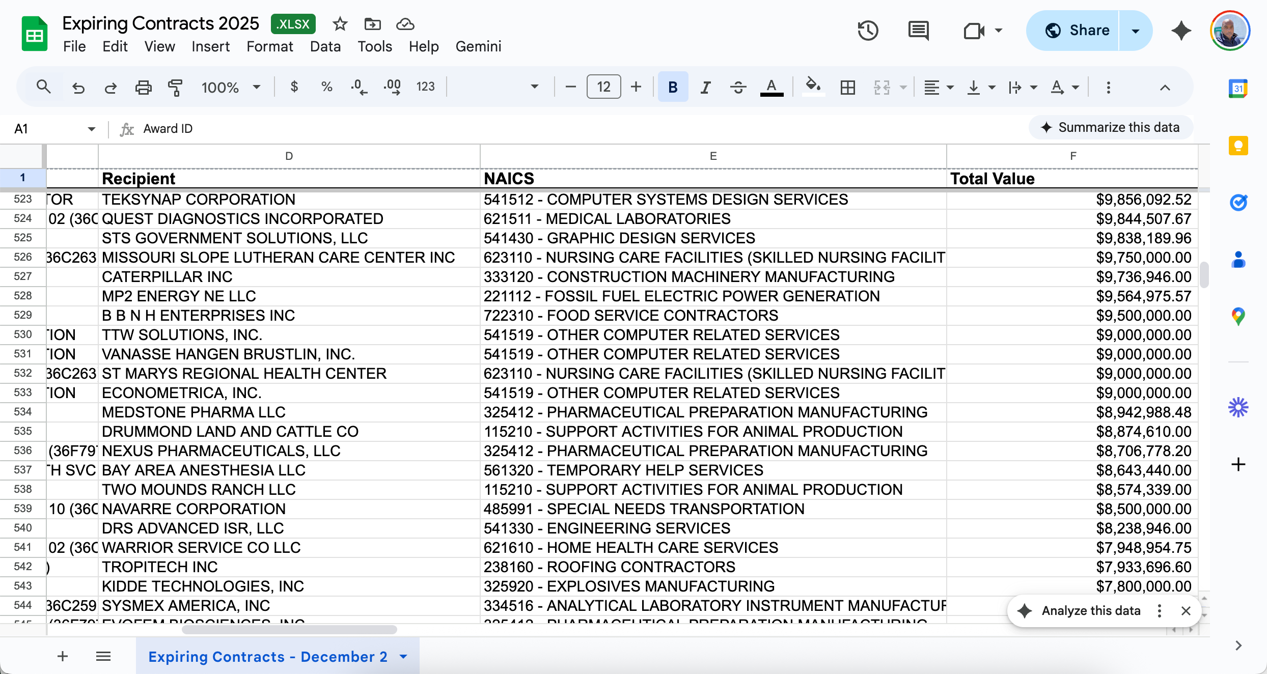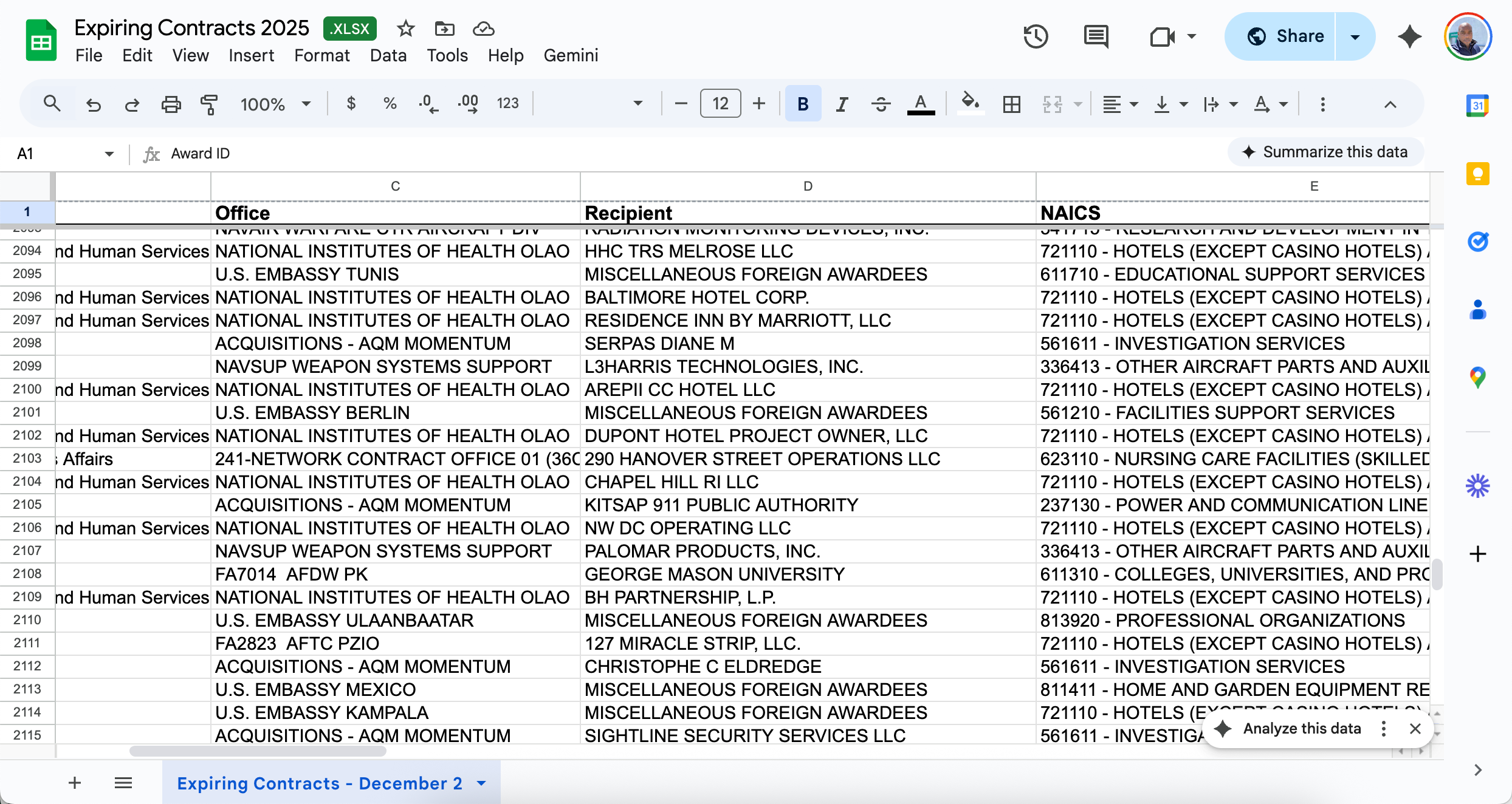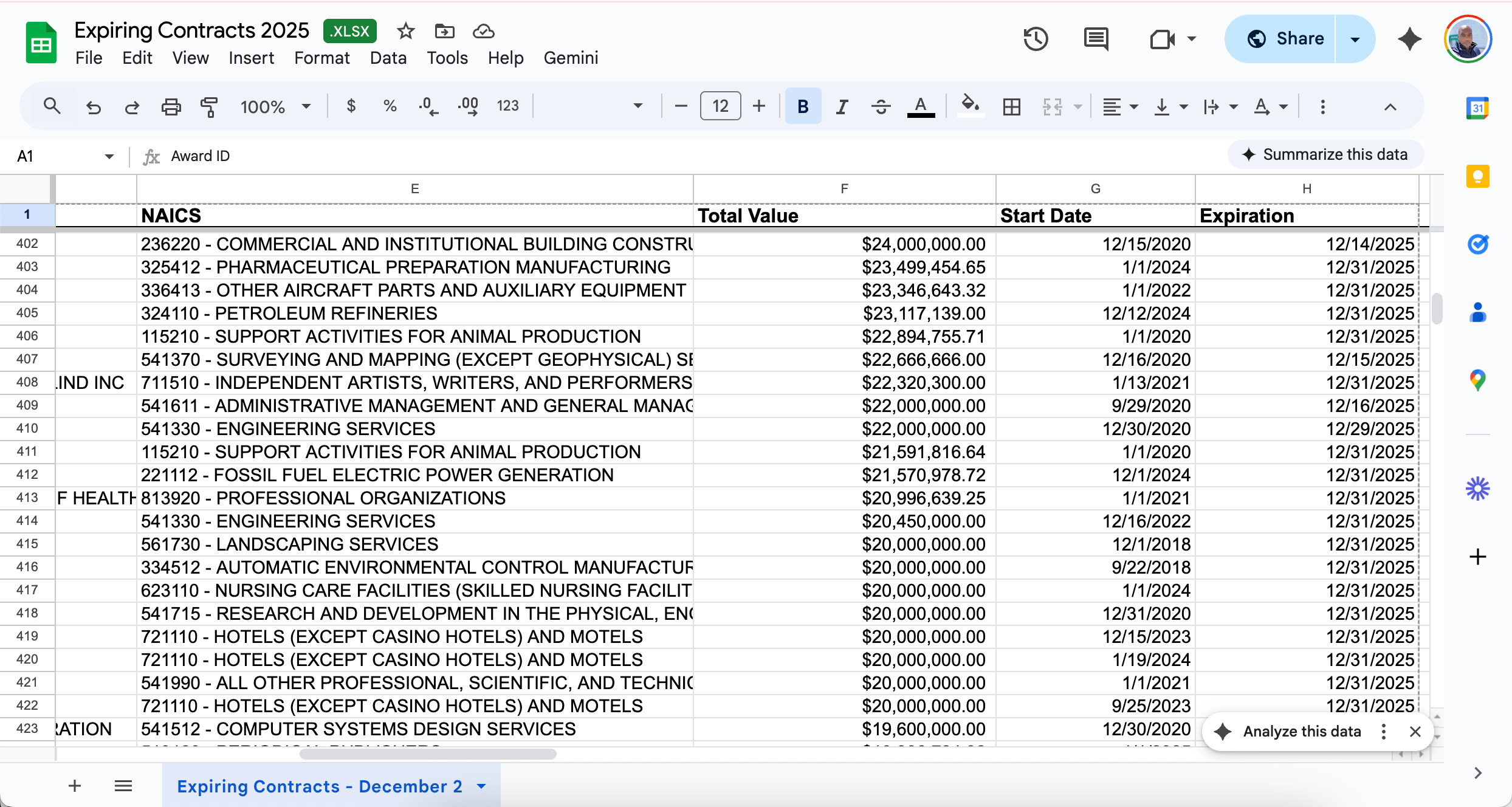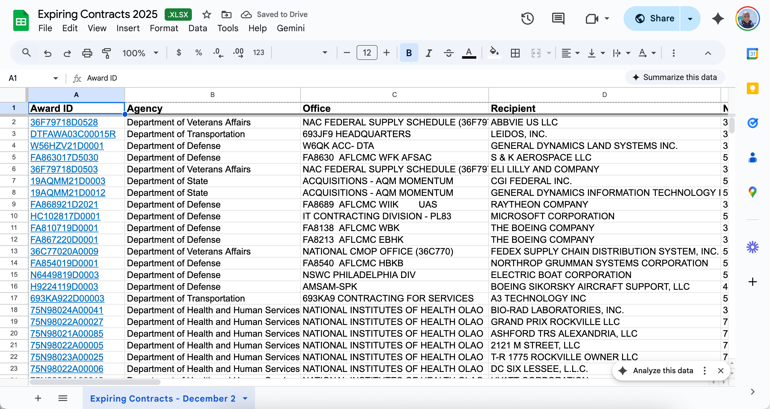 Get started with expiring federal contracts data without spending a dime. This free CSV file contains a sample of contracts that are set to expire, giving you a taste of the opportunities available. Import it into Excel, Google Sheets, or your CRM to start identifying recompete opportunities today.